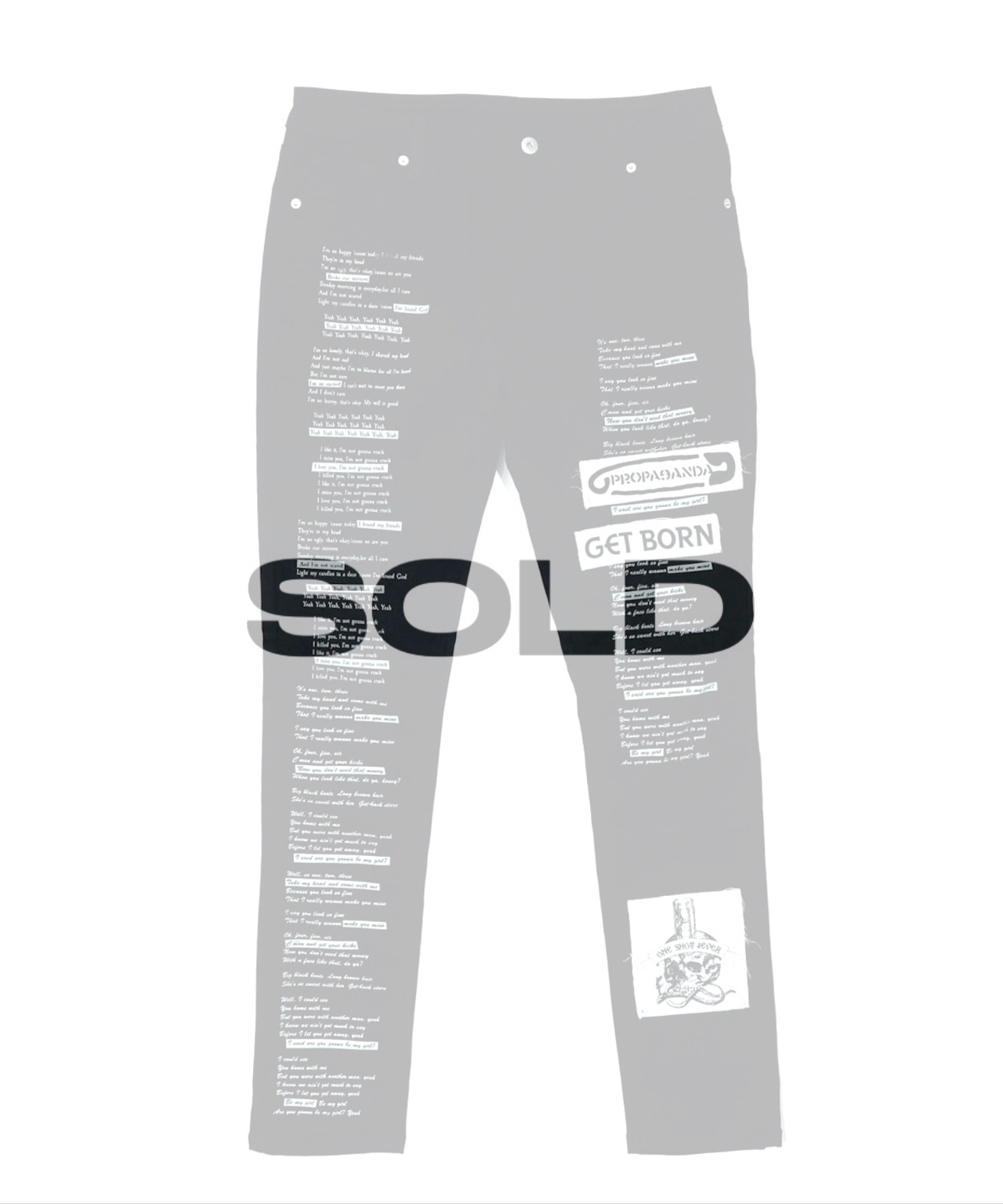 ストレッチの効いたパンツ脚部全体に、あの2つのバンドの歌詞をプリントし、パッチワークを施したブラックスキニーパンツです。